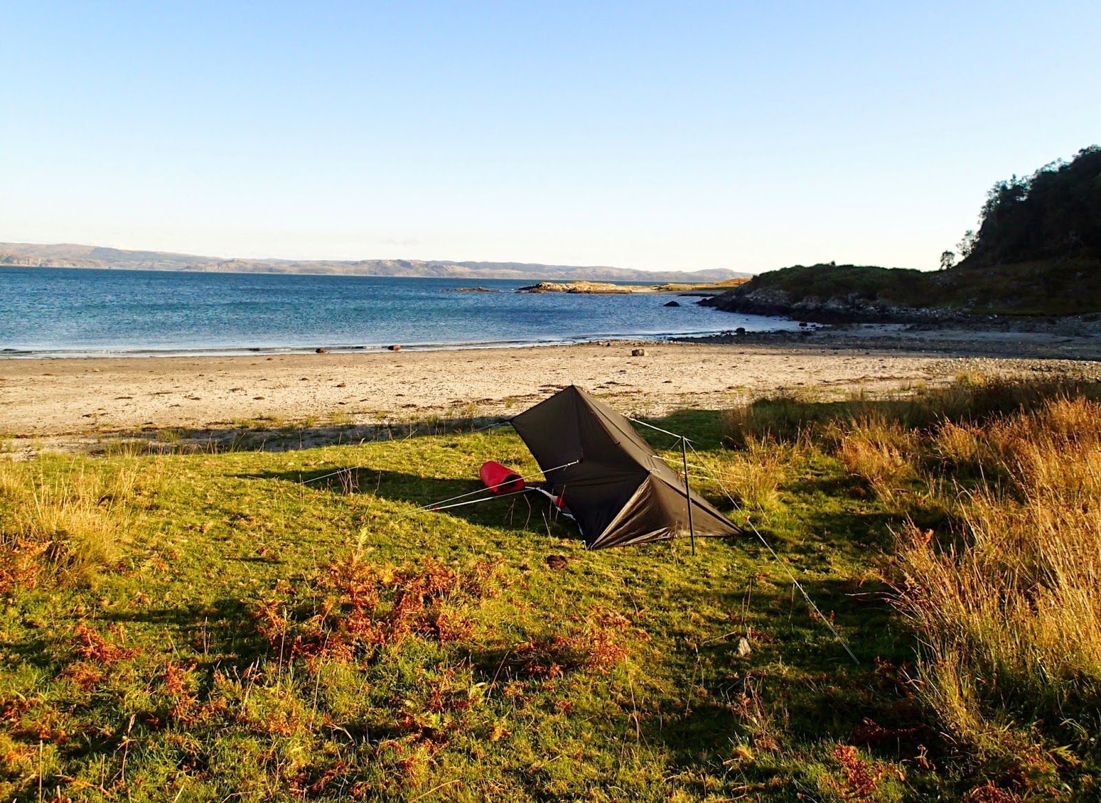 We quickly settled in, Dave pitching his tent while I faffed around rigging my tarp (with the settled weather forecast I'd decided to bivi instead of taking a tent). After dinner we sat up chatting until quite late feeding Dave's woodgas stove with bits of driftwood in lieu of having a proper fire and enjoying our surroundings.